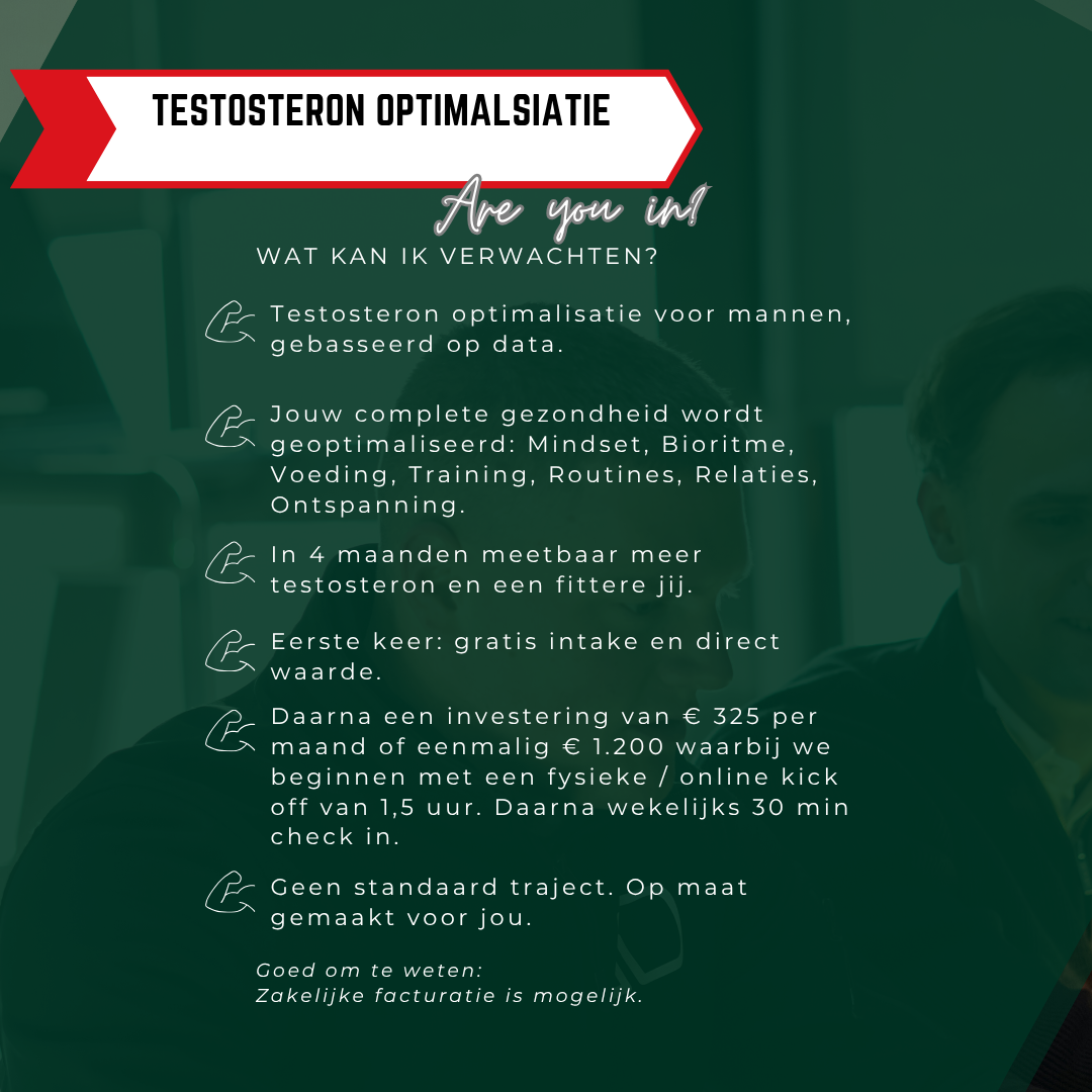 - We meten aan het begin de testosteron waardes. Door middel van coaching gaan we deze stap voor stap verhogen.